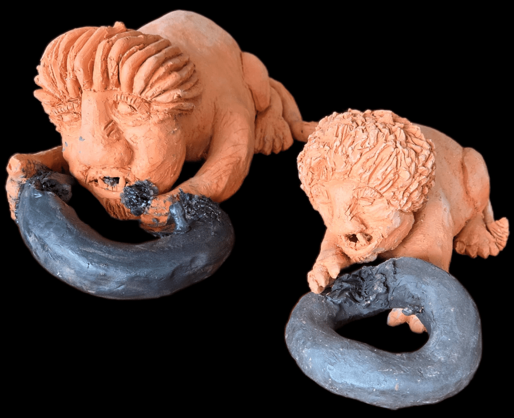 Two lions eating inner tubes